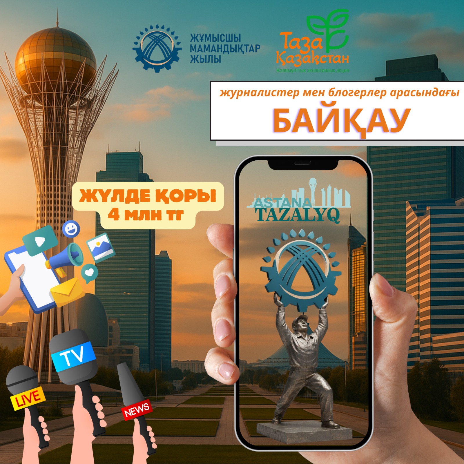 «Астана Тазалық» ЖШС БАҚ өкілдері мен блогерлер арасында байқау жариялайды. Жалпы жүлде қоры – 4 миллион теңге.